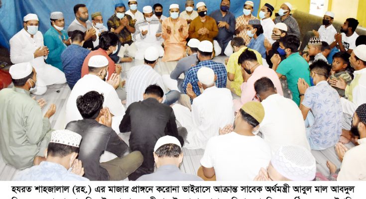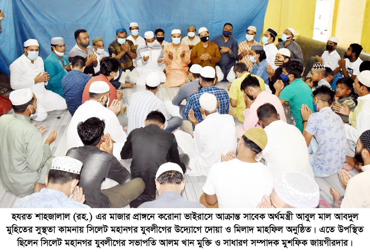করোনা ভাইরাসে আক্রান্ত সাবেক সফল অর্থমন্ত্রী, দুই বারের সিলেট-১ আসনের সাবেক সংসদ সদস্য ও বাংলাদেশ আওয়ামীলীগের উপদেষ্টা মন্ডলীর অন্যতম সদস্য আবুল মাল আবদুল মুহিতের সুস্থতা কামনায় সিলেট মহানগর যুবলীগের উদ্যোগে দোয়া ও মিলাদ মাহফিল অনুষ্ঠিত হয়েছে। শুক্রবার (৩০ জুলাই) বাদ আসর হযরত শাহজালাল (রহ.) এর মাজার প্রাঙ্গনে এই দোয়া ও মিলাদ মাহফিল অনুষ্ঠিত হয়।