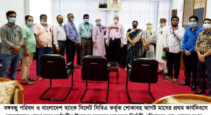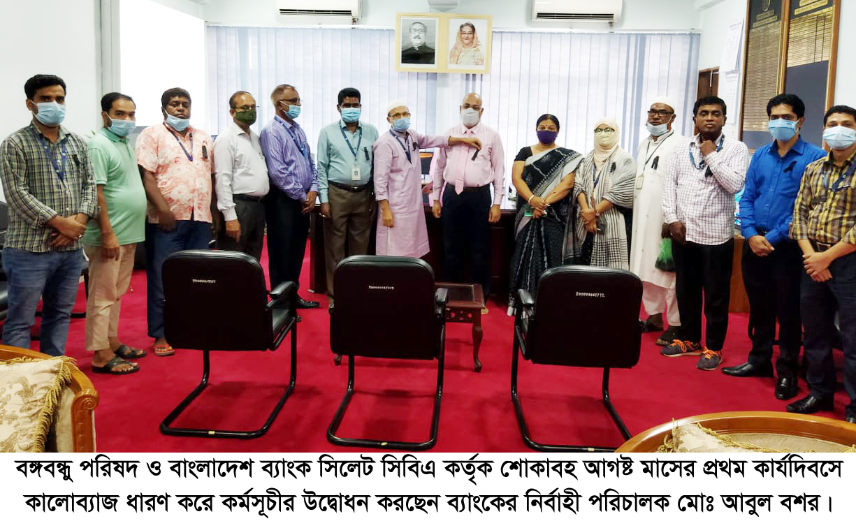 বঙ্গবন্ধু পরিষদ ও বাংলাদেশ ব্যাংক সিলেট সিবিএ কর্তৃক শোকাবহ আগষ্ট মাসের প্রথম কার্যদিবসে কালোব্যাজ ধারণ করে কর্মসূচীর উদ্বোধন করা হয়েছে। সোমবার (২ আগস্ট) সকালে ব্যাংকের নির্বাহী পরিচালক মোঃ আবুল বশর কে কালোব্যাজ পরিয়ে কর্মসূচির সুচনা করেন বঙ্গবন্ধু পরিষদ এবং নীল দলের সভাপতি মোঃ কবীর আহমেদ শরীফ।