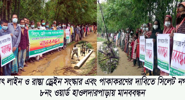 সিলেট সিটি কর্পোরেশনের ৮নং ওয়ার্ডস্থ হাওলদারপাড়ায় বিদ্যুৎ লাইন, রাস্তা-ড্রেন সংস্কার ও পাকাকরণের দাবিতে সচেতন এলাকাবাসী উদ্যোগে হাওলদারপাড়ায় এলাকায় বিশাল মানববন্ধন করেছে কয়েক হাজারো মানুষ। ‘ভাঙ্গা রাস্তার দিন শেষ, বঙ্গবন্ধুর বাংলাদেশ’ ‘মুজিব বর্ষের অঙ্গীকার পাকা রাস্তা হউক সবার’, ‘দাবি মোদের একটাই রাস্তাটা শুধু পাকা চাই’ সহ বিভিন্ন লেখা সম্মেলিত ব্যানার ও ফেস্টুন নিয়ে সচেতন এলাকাবাসীর ব্যানারে এ মানববন্ধন অনুষ্ঠিত হয়।