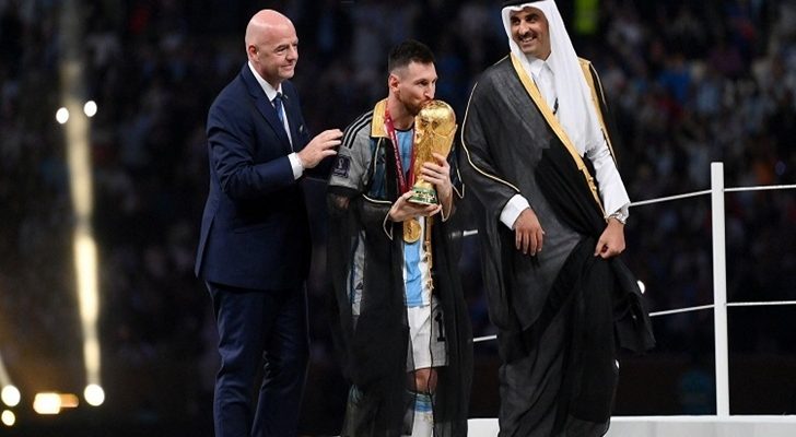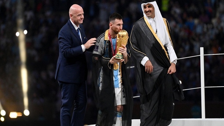 স্পোর্টস ডেস্ক:: চ্যাম্পিয়ন দলের হয়ে শিরোপা হাতে নেওয়ার আগে লিওনেল মেসিকে কালো আলখাল্লা পরিয়ে দিয়েছেন কাতারের আমির তামিম বিন হামাদ। কাতার সংস্কৃতিকে সাধারণত এ পোশাক পরেন মন্ত্রী পর্যায়ের ব্যক্তিরা।