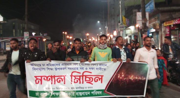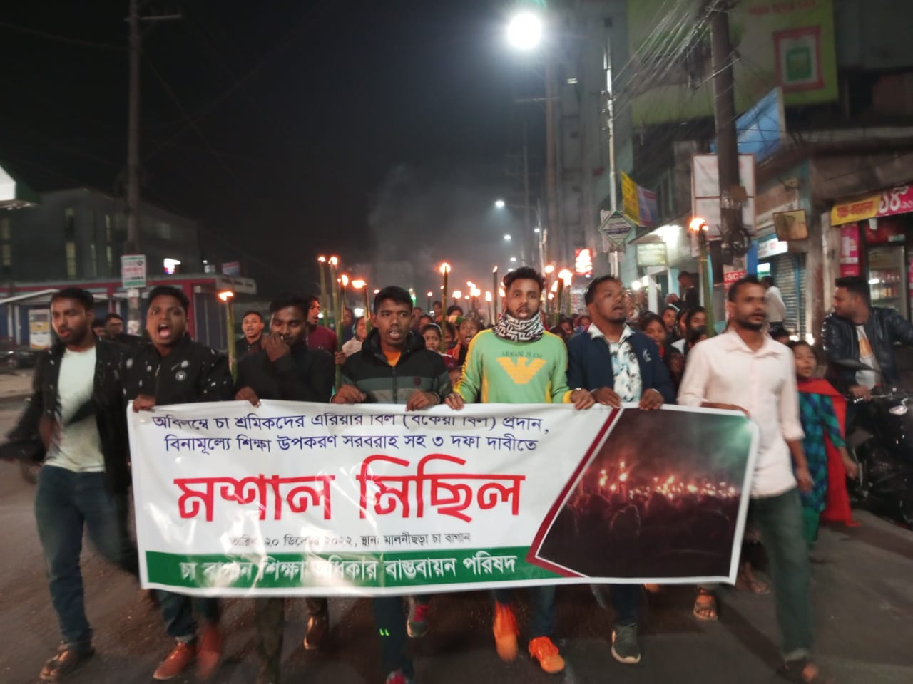 চা শ্রমিকদের এরিয়ার বিল (বকেয়া বেতন) প্রদান,চা বাগানের শিক্ষার্থীদের বিনামূল্যে শিক্ষা উপকরণ সরবরাহসহ ৩দফা দাবিতে মশাল মিছিল করেছে “চা বাগান শিক্ষা অধিকার বাস্তবায়ন পরিষদ”। সন্ধ্যা ৫ঃ৩০টায় মশাল মিছিলটি মালনীছড়া চা বাগান থেকে শুরু হয়ে লাক্কাতুরা,চৌকিদেখি হয়ে পুনরায় রেষ্টক্যাম্প বাজারে সমাবেশ মিলিত হয়। চা বাগান শিক্ষা অধিকার বাস্তবায়ন পরিষদের সংগঠক অধীর বাউরীর সভাপতিত্বে ও রানা বাউরীর পরিচারনায় অনুষ্ঠিত সমাবেশে বক্তব্য রাখেন,সংগঠনের প্রধান সংগঠক সঞ্জয় কান্ত দাস, সংহতি জানিয়ে বক্তব্য রাখেন বাংলাদেশ চা শ্রমিক ফেডারেশন সিলেট জেলার সাধারণ সম্পাদক অজিত রায়, চা শ্রমিক অধিকার আন্দোলন কেন্দ্রীয় কমিটির অহ্বায়ক হৃদেশ মুদি, লাক্কাতুরা চা বাগানের জাহাঙ্গীর হোসেন,কেওয়াছড়ার সঞ্জিত দাস,হিলুয়াছড়া চা বাগানের মজেন গঞ্জু প্রমুখ।