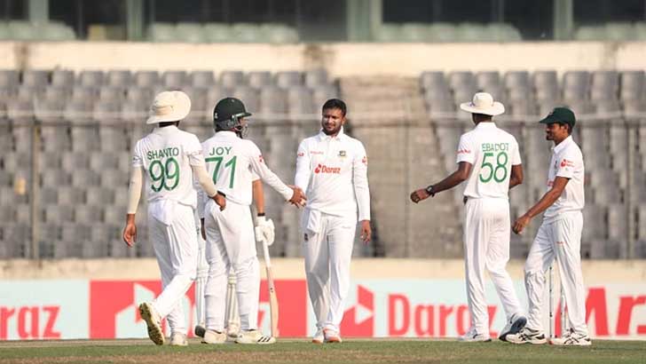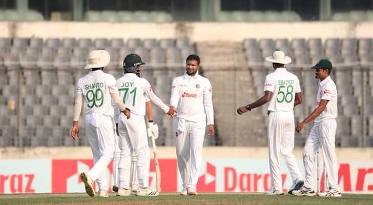 ৪০ রানে ৩ উইকেট পতনের পর মুশফিকুর রহিমের সঙ্গে ১৫৯ রানের জুটি গড়েন সাকিব আল হাসান। আক্রমণাত্মক ব্যাটিং করে যাওয়া সাকিব ৯৪ বলে ১৪টি বাউন্ডারির সাহায্যে ৮৭ রান করে আউট হন। ৫৫ রান করেন মিরাজ। আর ৪৩ রান করেন লিটন দাস।
