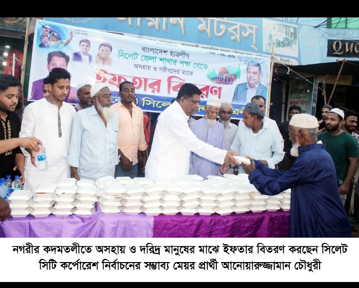 সিলেট সিটি কর্পোরেশ নির্বাচনের সম্ভাব্য মেয়র প্রার্থী আনোয়ারুজ্জামান চৌধুরীর পক্ষ থেকে নগরীর বিভিন্ন ওয়ার্ডে অসহায় ও দরিদ্র মানুষের মাঝে ইফতার বিতরণ অব্যাহত রয়েছে। বৃহস্পতিবার (৬ এপ্রিল) নগরীর কদমতলী ও শাহী ঈদগাহ পয়েন্টে অসহায় ও দরিদ্র মানুষের মাঝে ইফতার বিতরণ করেন তিনি।