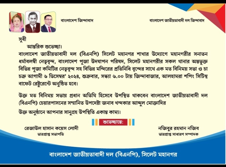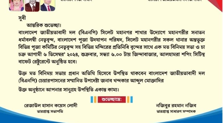 বাংলাদেশ জাতীয়তাবাদী দল (বিএনপি) সিলেট মহানগর শাখার উদ্যোগে মহানগরীর সনাতন ধর্মাবলম্বী নেতৃবৃন্দ, বাংলাদেশ পূজা উদযাপন পরিষদ, সিলেট মহানগরীর সকল থানার অন্তভূক্ত বিভিন্ন পূজা কমিটির নেতৃবৃন্দ সহ বিভিন্ন মন্দিরের প্রতিনিধি বৃন্দের সাথে এক মতবিনিময় সভা ও চা চক্র শুক্রবার (৬ ডিসেম্বর) সন্ধ্যা ৬টায় জিন্দাবাজারস্থ আলহামরা শপিং সিটিস্থ বাফেট রেষ্টুরেন্টে অনুষ্ঠিত হবে।