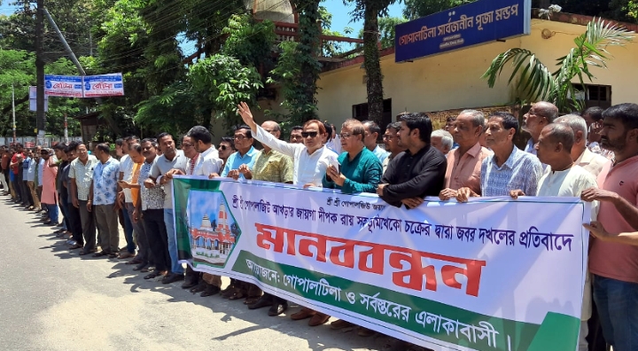 এলাকার প্রবীণ মুরব্বী কানুলাল চক্রবর্তীর সভাপতিত্বে ও গোপাল জিউ আখড়া পরিচালনা কমিটির সদস্য পলাশ চক্রবর্তী এবং জেলা স্বেচ্ছাসেবক দলের যুগ্ম আহবায়ক টিটন মল্লিকের যৌথ পরিচালনায় সাধারণ সভা শেষে মন্দিরের সম্মুখের প্রদান রাস্তায় আয়োজিত মানববন্ধনে বক্তরা বলেন, গোপালজিউ আখড়ার ভূমি দখলকারী দিপক রায় দিপুসহ সকল ভূমিখেকো চক্রের হাত থেকে দখলকৃত দেবত্ব সম্পত্তি উদ্ধার এবং জড়িতকারীদের গ্রেফতার করে দ্রুত আইনের আওতায় আনার জোরদাবী জানান। অন্যথায় সিলেটের সর্বস্থরের জনসাধারণকে নিয়ে রাজপথে কঠোর আন্দোলন গড়ে তোলার হুশিয়ারী জানান। বক্তারা ক্ষোভ প্রকাশ করে বলেন, এ ব্যাপারে সংশ্লিষ্ট্র প্রশাসনকে তাৎক্ষণিক বিষয়টি জানালেও এখন পর্যন্ত বিহীত ব্যবস্থা না নেওয়ার উদ্বেগ প্রকাশ করা হয়। বক্তারা উচ্চ আদালতের নিষেধাজ্ঞা থাকার পরও উক্ত দেবত্ব ভূমিতে দিপক রায় দিপুসহ অন্যান্য ভূমিখেকো চক্র আইন অমান্য করে ভূমি দখল করে স্থাপনা নির্মাণ করে যাচ্ছে। এই সকল ভূমি দখলকারীদের দ্রুত গ্রেফতার করে দখলকৃত স্থাপনাগুলো উচ্ছেদের দাবী জানান। এ ব্যাপারে সিলেট জেলা প্রশাসন ও পুলিশ প্রশাসন সহ সংশ্লিষ্ট্রদের তড়িৎ পদক্ষেপ গ্রহণের দাবী জানান বক্তারা।