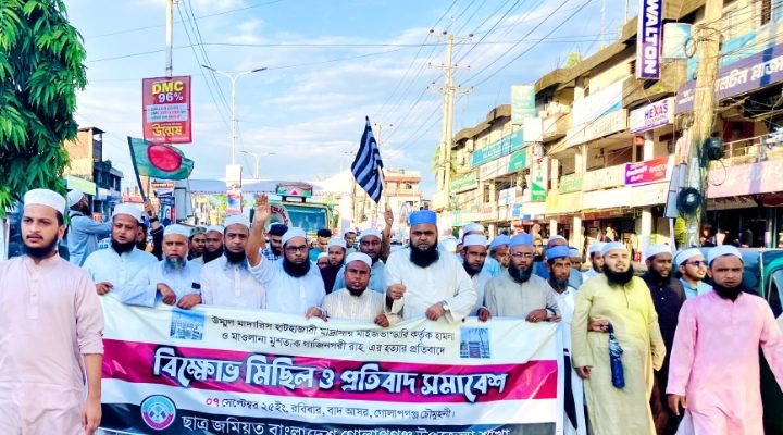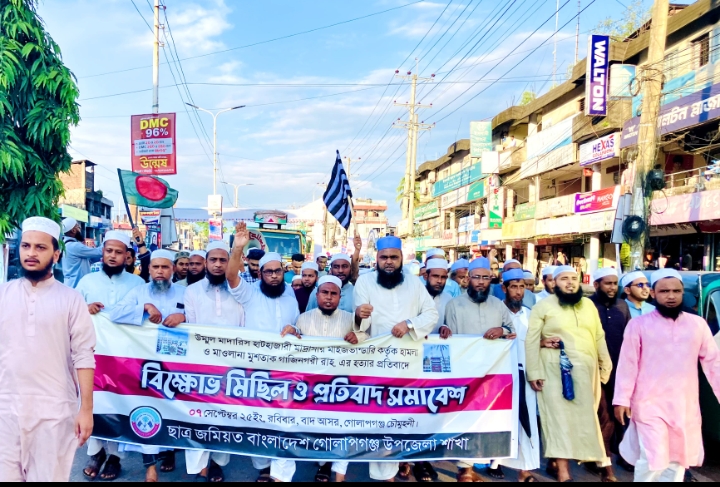 উম্মুল মাদারিস হাটহাজারী মাদরাসার শিক্ষার্থীদের উপর ভণ্ড মাজারপুজারীদের বর্বরোচিত হামলা এবং জমিয়তের কেন্দ্রীয় নেতা মাওলানা মুশতাক আহমদ গাজীনগরী রহ.-কে নৃশংসভাবে হত্যার প্রতিবাদে বিক্ষোভ মিছিল ও প্রতিবাদ সমাবেশ করেছে ছাত্র জমিয়ত বাংলাদেশ গোলাপগঞ্জ উপজেলা শাখা।