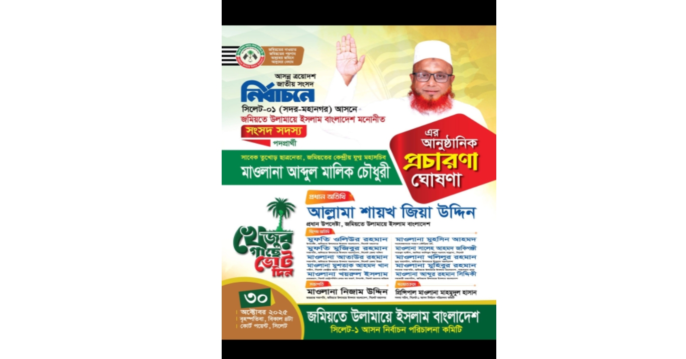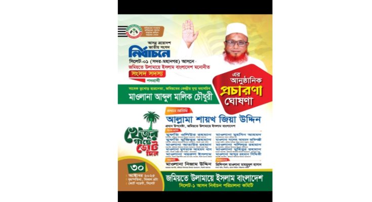 সিলেট-১ (সদর-মহানগর) আসনে জমিয়তের প্রার্থীর আনুষ্ঠানিক নির্বাচনী প্রচারণা আজ শুরু