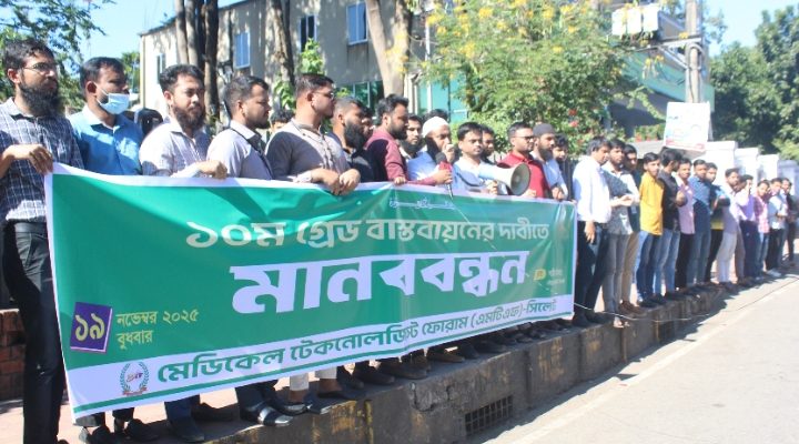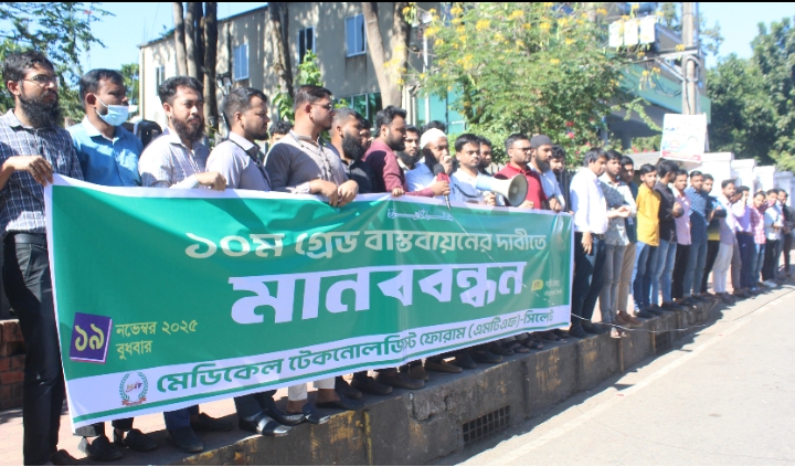 মেডিকেল টেকনোলজিস্ট ও ফার্মাসিস্টদের ন্যায্য অধিকার ১০ম গ্রেড বাস্তবায়নের দাবিতে মেডিকেল টেকনোলজিস্ট ফোরাম (এম.টি.এফ) সিলেটের উদ্যোগে বুধবার (১৯ নভেম্বর) বেলা ১২টায় সিলেট নগরীর চৌহাট্টাস্থ কেন্দ্রীয় শহীদ মিনারের সামনে এক মানববন্ধন অনুষ্ঠিত হয়।