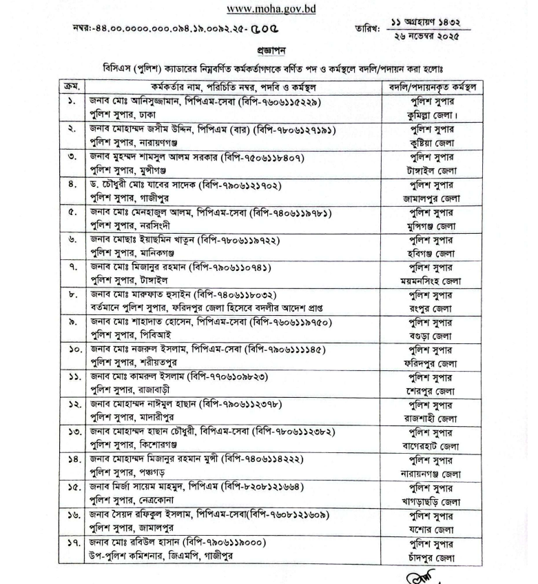 বুধবার (২৬ নভেম্বর) স্বরাষ্ট্র মন্ত্রণালয়ের উপসচিব মো. মাহবুবুর রহমান স্বাক্ষরিত এক প্রজ্ঞাপনে এ পদায়নের তথ্য জানানো হয়।