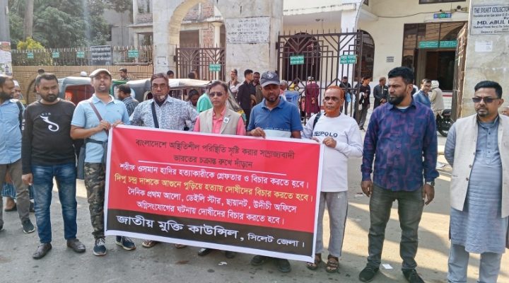 ২০ ডিসেম্বর জাতীয় মুক্তি কাউন্সিল সিলেট শাখার উদ্যোগে বন্দর বাজারে কালেক্টোরেট মসজিদের সামনে এক প্রতিবাদ সমাবেশ অনুষ্ঠিত হয়। উক্ত সমাবেশ হতে ইনকিলাব মঞ্চের আহ্বায়ক শরিফ ওসমান হাদির হত্যাকারীরকে গ্রেফতার ও বিচার করার দাবি জানানো হয়। সেই সাথে ময়মনসিংহে ভালুকায় নিপু চন্দ্র দাসকে আগুনে পুড়িয়ে হত্যার সাথে জড়িতদের গ্রেফতার ও বিচারের দাবি জানানো হয়। সমাবেশ হতে দৈনিক প্রথম আলো, ডেইলি স্টার, ছায়ানট ও উদীচীর অফিসে অগ্নিকাণ্ড, ভাংচুর লুটপাটের সাথে যুক্তদের গ্রেফতার ও বিচারের দাবি জানানো হয়।