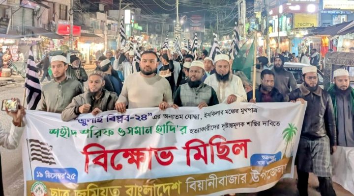 ইনকিলাব মঞ্চের মুখপাত্র ও জুলাই বিপ্লবের অকুতোভয় সৈনিক শহীদ শরিফ ওসমান হাদির হত্যাকারীদের দ্রুত বিচারের দাবিতে ছাত্র জমিয়ত বাংলাদেশ বিয়ানীবাজার উপজেলা শাখার উদ্যোগে বিক্ষোভ মিছিল অনুষ্ঠিত হয়েছে।