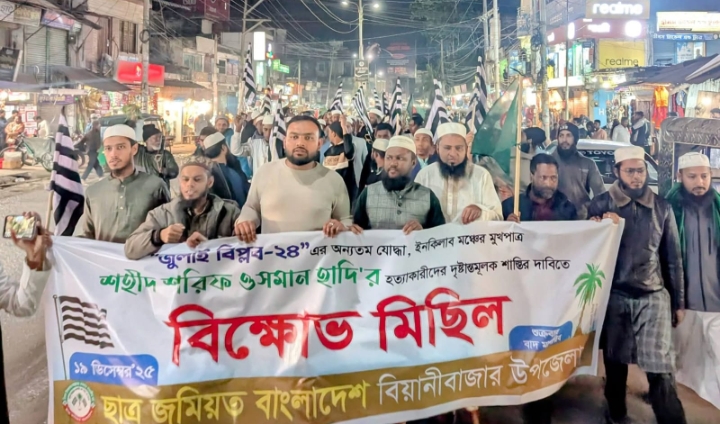 ইনকিলাব মঞ্চের মুখপাত্র ও জুলাই বিপ্লবের অকুতোভয় সৈনিক শহীদ শরিফ ওসমান হাদির হত্যাকারীদের দ্রুত বিচারের দাবিতে ছাত্র জমিয়ত বাংলাদেশ বিয়ানীবাজার উপজেলা শাখার উদ্যোগে বিক্ষোভ মিছিল অনুষ্ঠিত হয়েছে।