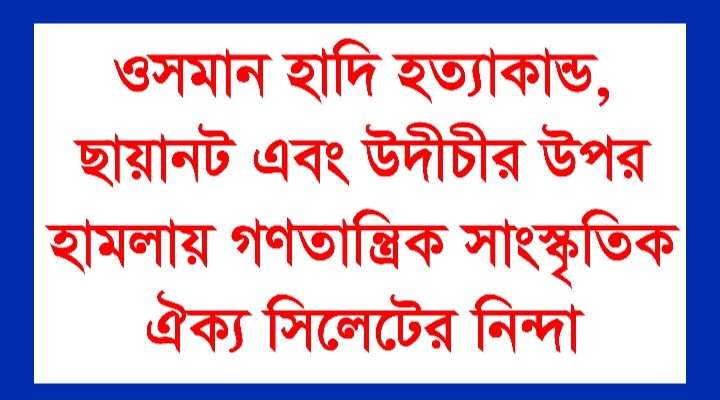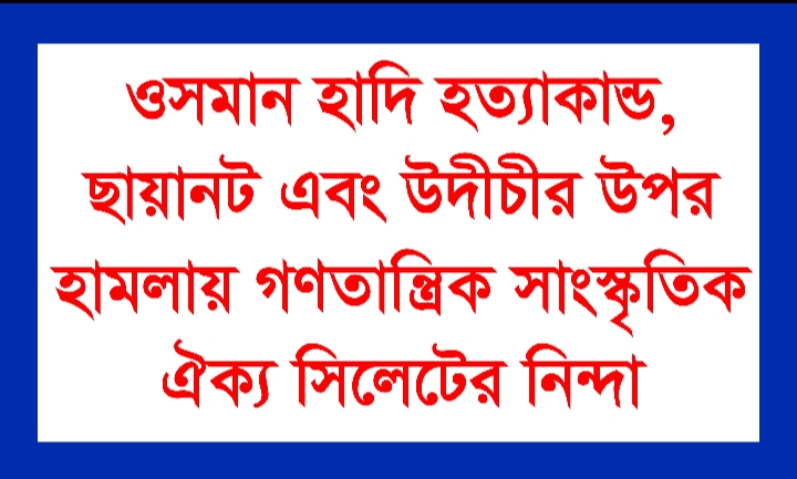 ওসমান হাদি হত্যাকান্ড, ছায়ানট এবং উদীচীর উপর হামলায় গণতান্ত্রিক সাংস্কৃতিক ঐক্য সিলেটের নিন্দা