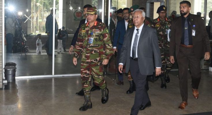 রোববার (২১ ডিসেম্বর) দুপুর ১২টার দিকে নির্বাচন ভবনে আসেন সেনাবাহিনী প্রধান জেনারেল ওয়াকার-উজ-জামান, নৌবাহিনী প্রধান অ্যাডমিরাল মোহাম্মদ নাজমুল হাসান ও বিমান বাহিনী প্রধান এয়ার চিফ মার্শাল হাসান মাহমুদ খান।