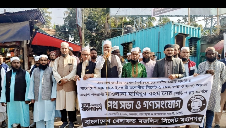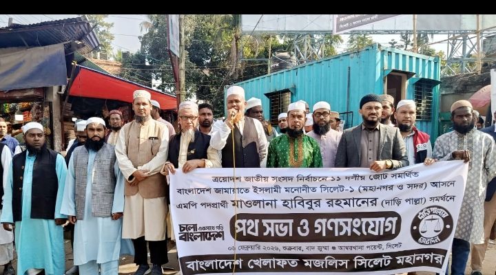 বাংলাদেশ খেলাফত মজলিস সিলেট মহানগর শাখার উদ্যোগে ত্রয়োদশ জাতীয় সংসদ নির্বাচনে ১১ দলীয় ঐক্যজোট সমর্থিত বাংলাদেশ জামায়াতে ইসলামী মনোনীত সিলেট-১ আসনে মাওলানা হাবিবুর রহমানের দাঁড়িপাল্লার সমর্থনে শুক্রবার বাদ জুময়া নগরীর আম্বরখানা পয়েন্টে লিফলেট বিতরণ, গণসংযোগ, পথসভা শাখা সভাপতি জননেতা আলহাজ্ব মাওলানা এমরান আলমের সভাপতিত্বে ও সাধারণ সম্পাদক মুহাম্মদ আব্দুল গাফফারের পরিচালনায় অনুষ্ঠিত হয়।