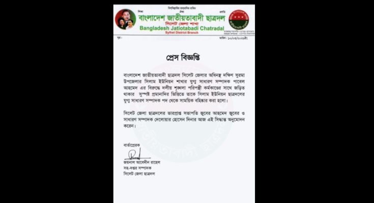 বিজ্ঞপ্তিতে জানানো হয়, সিলেট জেলা ছাত্রদলের ভারপ্রাপ্ত সভাপতি জুবের আহমেদ জুবের ও সাধারণ সম্পাদক দেলোয়ার হোসেন দিনার আজ এই বহিষ্কারাদেশ অনুমোদন করেছেন। সিলাম ইউনিয়ন ছাত্রদলের যুগ্ম সাধারণ সম্পাদক পাবেল আহমেদের বিরুদ্ধে শৃঙ্খলা ভঙ্গের সুনির্দিষ্ট অভিযোগ পাওয়ায় তাকে পদ থেকে অব্যাহতি দেওয়া হলো।