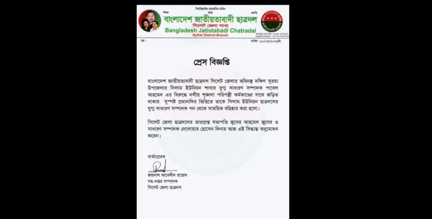 সিলেট জেলা ছাত্রদলের আওতাধীন দক্ষিণ সুরমা উপজেলার সিলাম ইউনিয়ন শাখার যুগ্ম সাধারণ সম্পাদক পাবেল আহমেদকে দলীয় পদ থেকে সাময়িক বহিষ্কার করা হয়েছে। দলীয় শৃঙ্খলা পরিপন্থী কর্মকাণ্ডে জড়িত থাকার সুস্পষ্ট প্রমাণের ভিত্তিতে তার বিরুদ্ধে এই শাস্তিমূলক ব্যবস্থা গ্রহণ করা হয়।