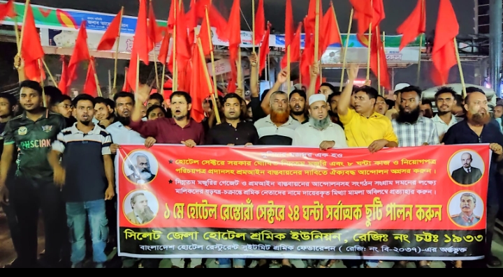 ১৪১-তম আন্তর্জাতিক শ্রমিক সংহতি দিবস মহান মে দিবসে সকল হোটেল শ্রমিকদের খানাদানা বেতনসহ সর্বাত্মক ছুটি বাস্তবায়নের দাবিতে আজ (৩০ এপ্রিল) নগরিতে বিক্ষোভ মিছিল সমাবেশ করে সিলেট জেলা হোটেল শ্রমিক ইউনিয়ন।
