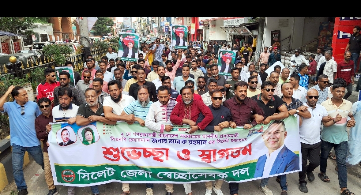 গনপ্রজাতন্ত্রী বাংলাদেশের সরকারের মাননীয় প্রধানমন্ত্রী ও বিএনপি চেয়ারম্যান তারেক রহমানের আগামী ২ মে সিলেট সফরকে স্বাগত জানিয়ে মিছিল ও সমাবেশ করেছে সিলেট জেলা স্বেচ্ছাসেবক দল। বৃহসম্পতিবার বিকেলে নগরীর দরগাহ গেইট সংলগ্ন সুলেমান হলের সামন থেকে মিছিল শুরু করে কোর্ট পয়েন্টে গিয়ে সমাবেশের মাধ্যমে শেষ হয়।